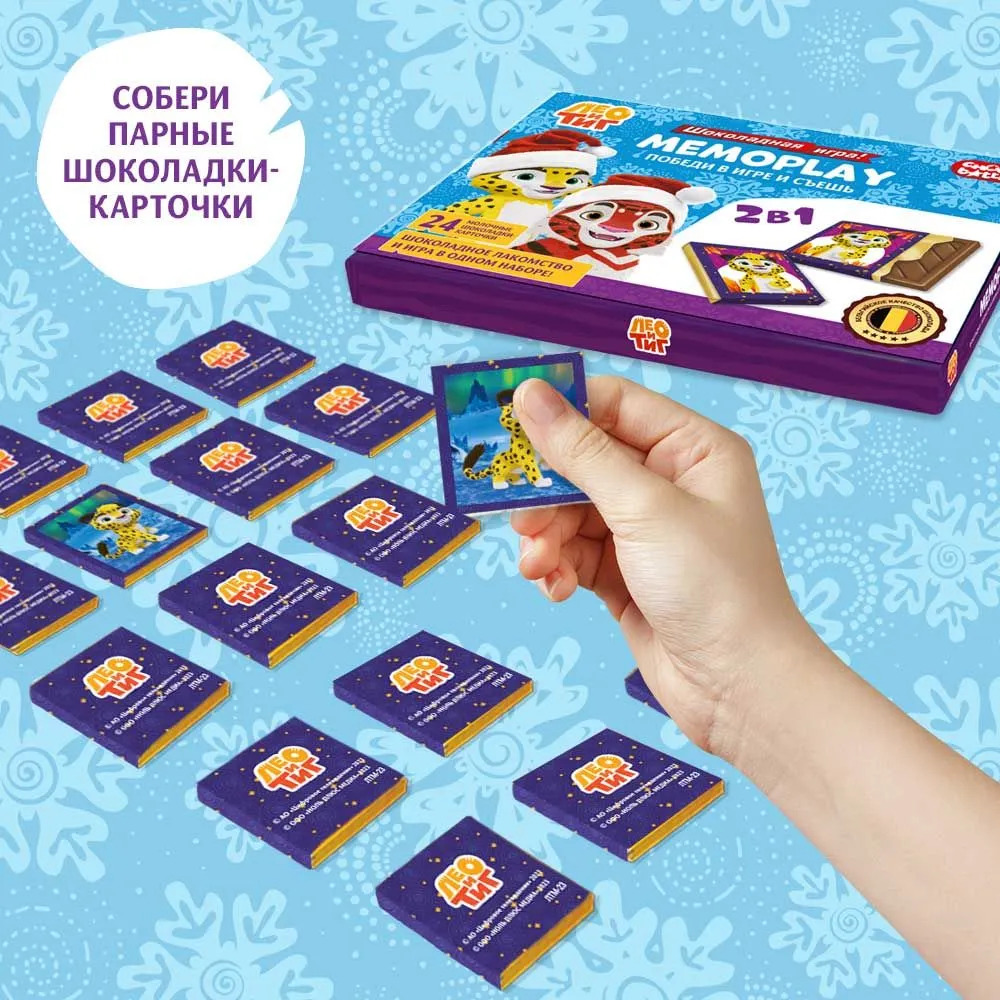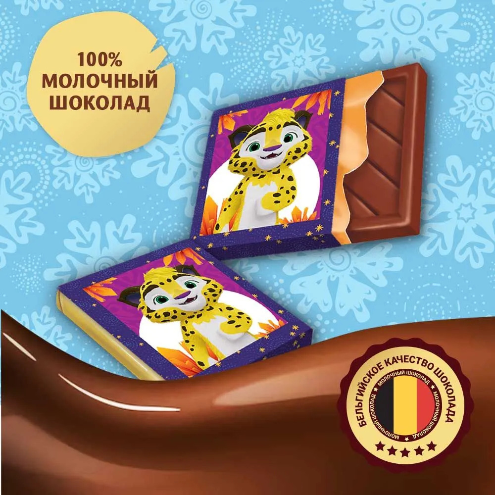 Фишки с героями - 4; шоколадные карточки героев - 20; юбилейные шоколадки-карточки ДАБЛ-БАТТЛ с заданиями - 4; игровое поле - 1; стрелка - 1; картонная коробка; шоколад молочный